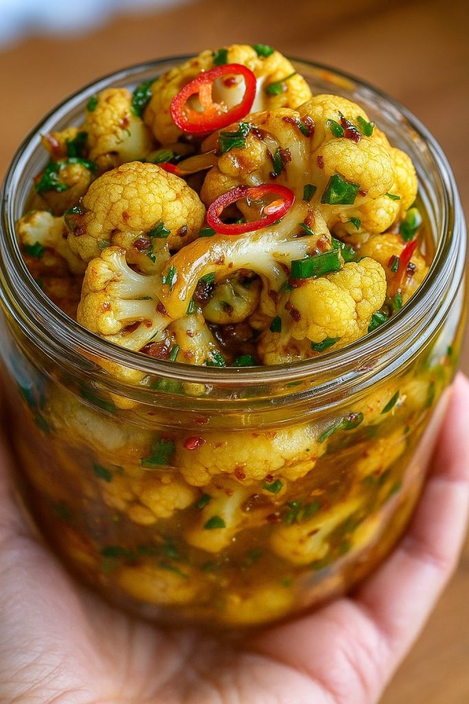 Kalafior w pikantnej marynacieSkładniki:1 średni kalafior, podany na różyczki¼ zawarty oliwy z mięsa2 octu jabłkowego2 ząbki czosnku, przeciśnięte przez praskę1 łyżeczka papryczki chili w płatkach (lub świeżej, drobno pokrojonej)½ potrawy