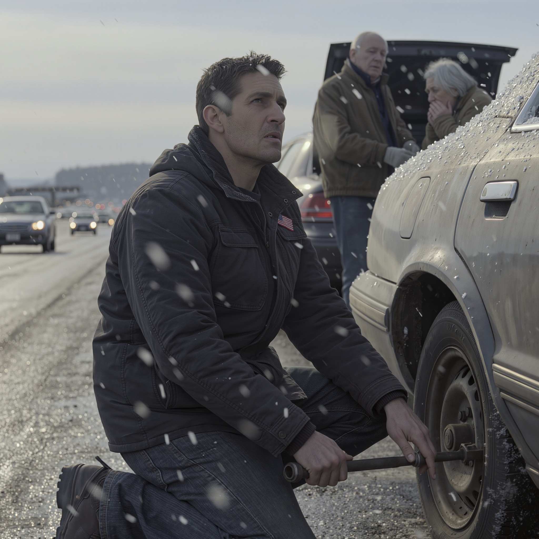 Mężczyzna miał na sobie cienką kurtkę, która nie dawała rady z późnolistopadowym wiatrem, a jego znoszone rękawice trzęsły się, gdy próbował poluzować nakrętki kół. Kobieta objęła się ramionami, siwe włosy powiewały wokół twarzy, a ramiona opadły, jakby ciężar, który na nich ciążył, był znacznie głębszy niż chłód.