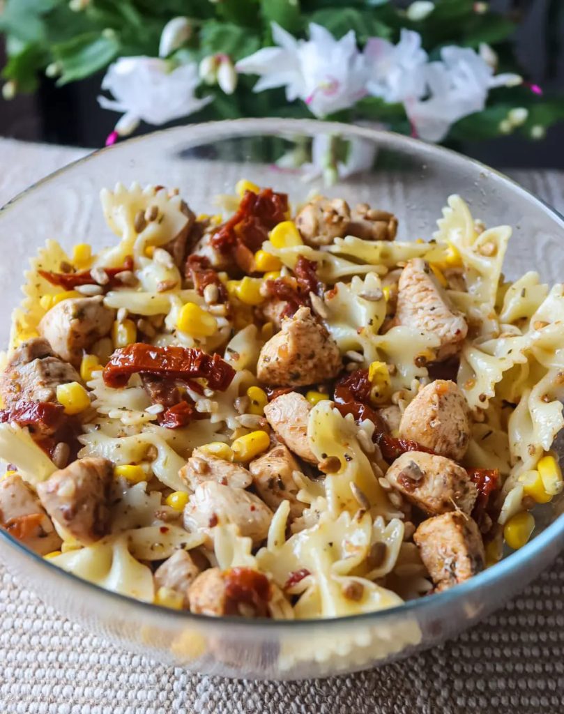 Składniki: 150 g makaronu kokardki 1 pierś z kurczaka 1/2 puszki kukurydzy 1 słoik pomidorów suszonych 5 łyżek prażonych ziaren słonecznika Sos: 5 łyżek oleju z suszonych pomidorów Sól do