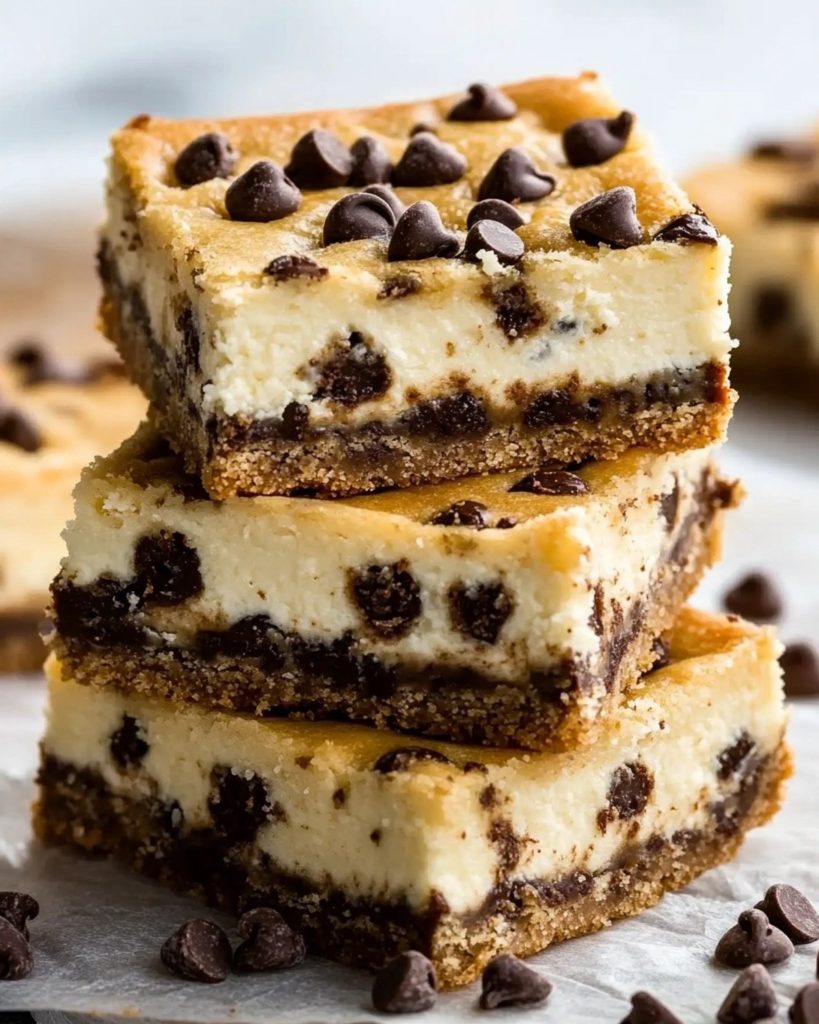 🍪🍫 Te batony sernika z kawałkami czekolady łączą w sobie to, co najlepsze z obu światów: klasyczne ciasto z kawałkami czekolady z kremowym środkiem sernika, zwieńczone kolejną warstwą ciasta z