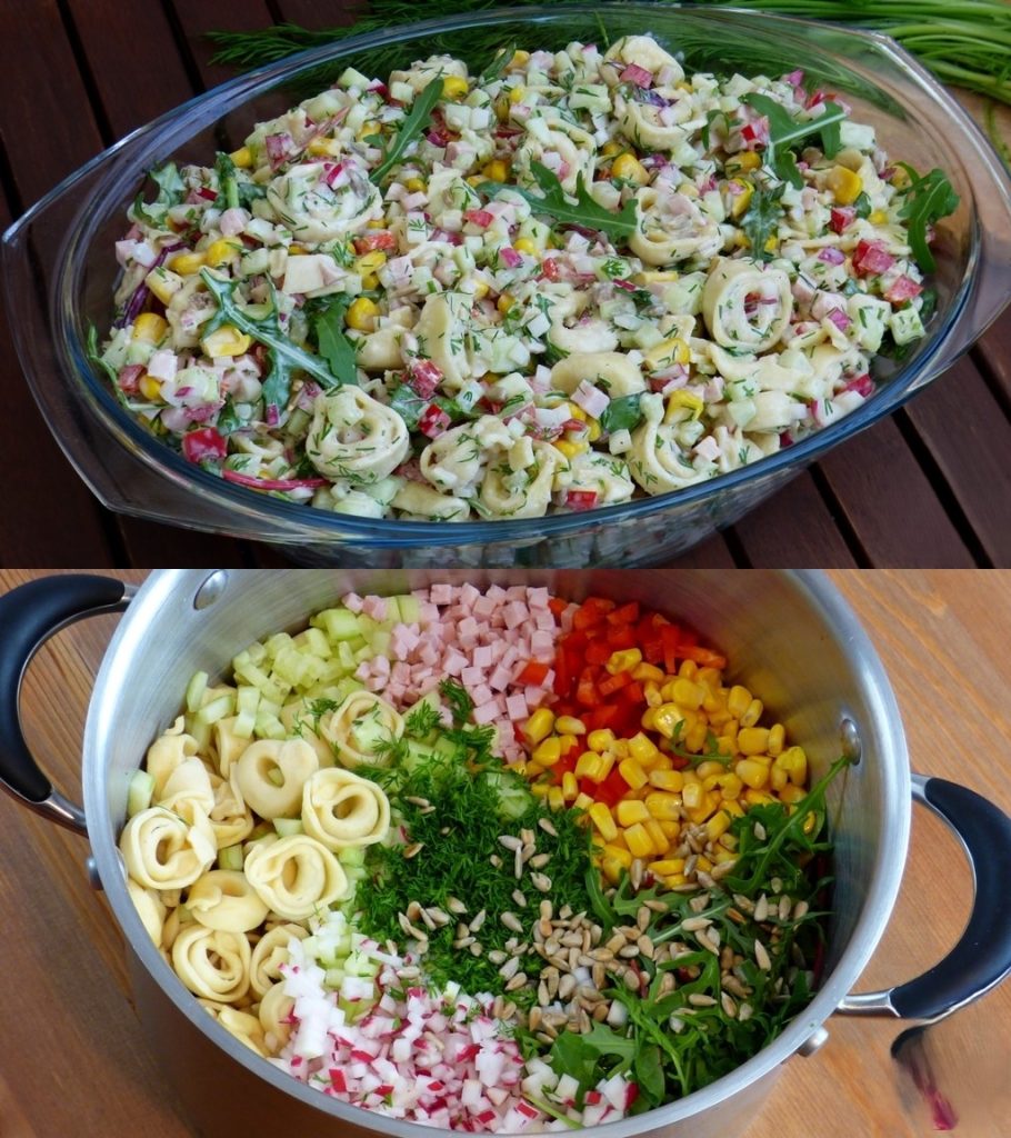 Składniki: 1 opakowanie tortellini (250 g) – z ulubionym nadzieniem, u mnie z mięsem pół papryki czerwonej (można dać więcej) 1 duży ogórek świeży kilka rzodkiewek 150 gram szynki (może
