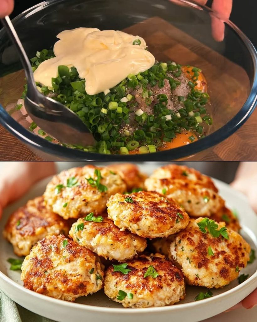 Składniki 4 filety z kurczaka pokrojone w kostkę lub siekane 3 jajka 1 łyżeczka włoskich ziół 2 zielone cebulki, drobno posiekane 2 łyżki majonezu 200 g startego sera (mozzarella, cheddar