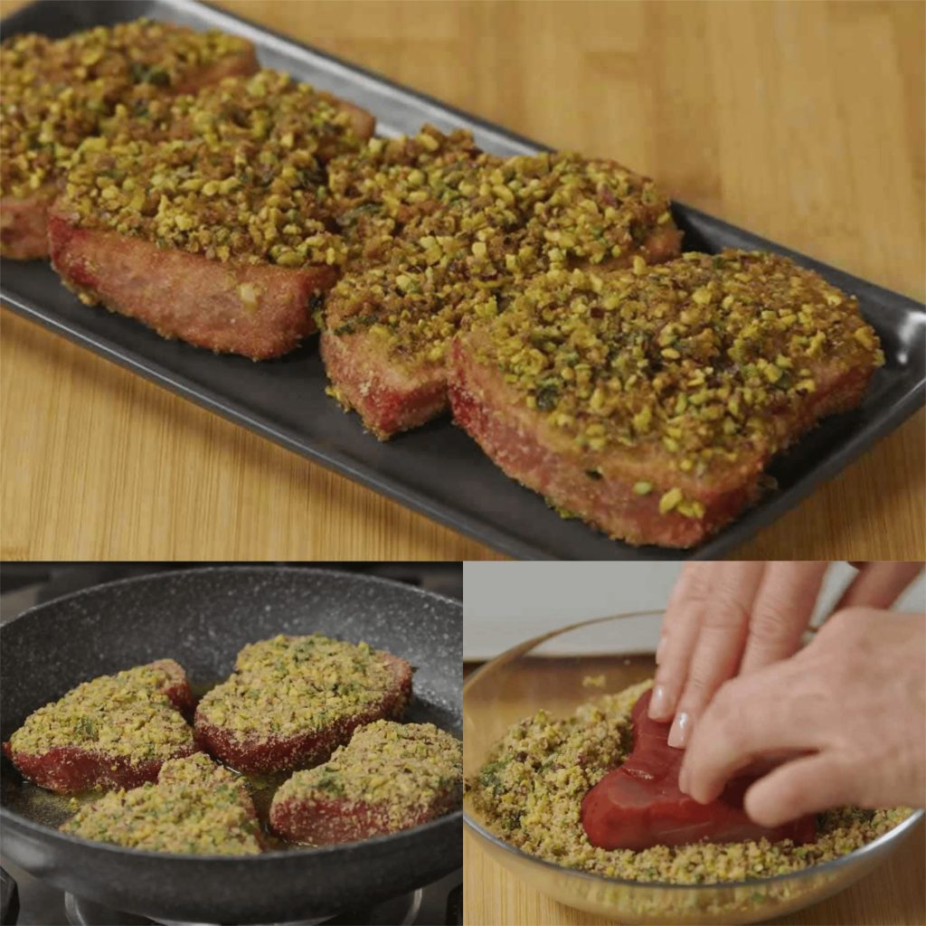 Składniki Dawki dla 4 osób 600 g filetów z tuńczyka 80 g posiekanych pistacji 100 g bułki tartej 1 ząbek czosnku pietruszka do smaku oliwa z oliwek z pierwszego tłoczenia