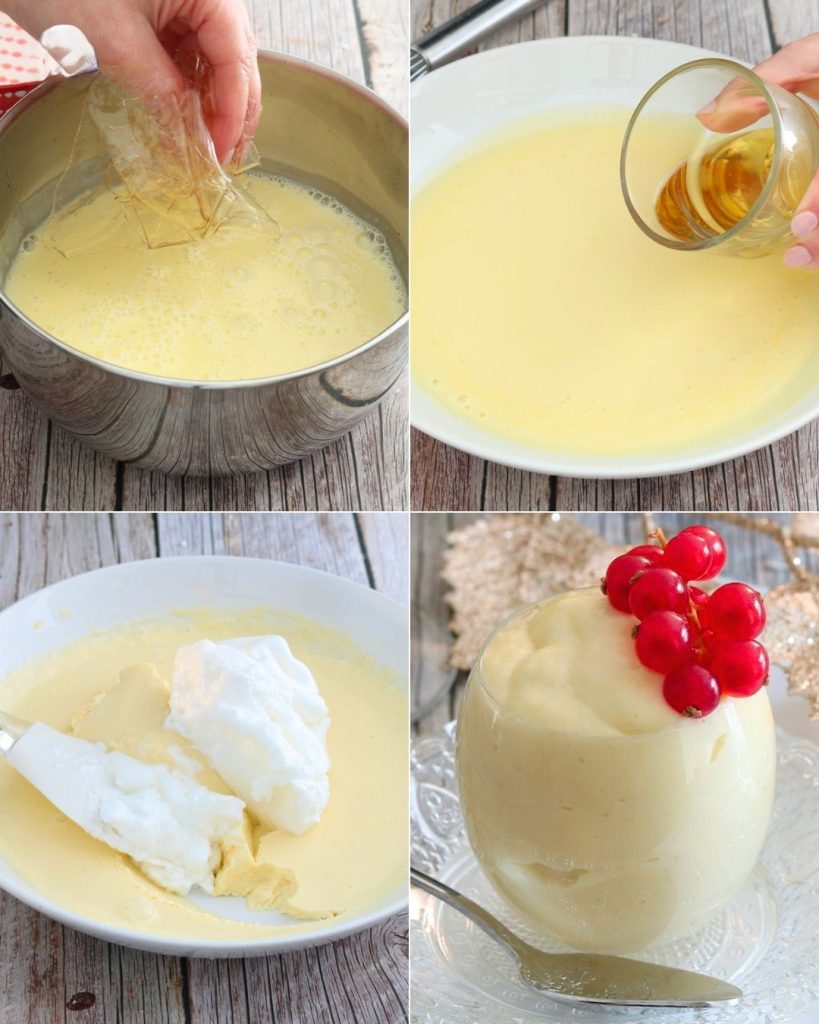Składniki: 500 g kremu angielskiego 150 ml szampana 18 g żelatyny w listkach 4 białka jaj 100 g cukru Gałązki porzeczek do dekoracji Przygotowanie: Namocz listki żelatyny w zimnej wodzie