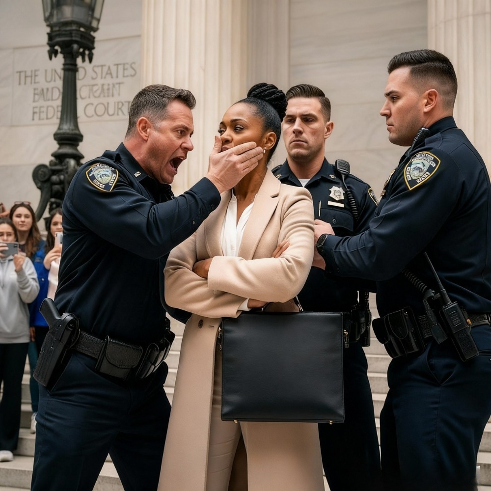 Zanim kamera monitoringu uchwyciła pierwszą klatkę, wyglądało to już jak ujęcie otwierające skandaliczny dokument – taki, który gromadzi miliony wyświetleń na amerykańskich kanałach kryminalnych. Poranne słońce odbijało się od szkła i stali, malując budynek sądu w centrum Harbor City w USA ostrym blaskiem nowego dnia. Pasażerowie płynęły obok niczym rzeka filiżanek do kawy i teczek, a flagi leniwie powiewały nad wejściem. A pośrodku tych szerokich kamiennych schodów funkcjonariusz w granatowym mundurze zastąpił drogę kobiecie w cywilu i w ułamku sekundy uznał, że nie pasuje do tego miejsca.