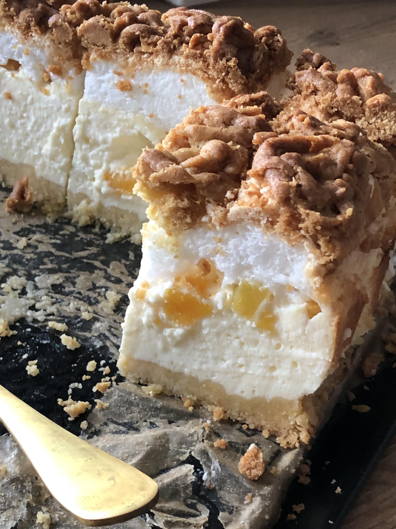 To jeden z moich ulubionych przepisów na sernik! Kruche ciasto, wilgotna masa serowa z dodatkiem brzoskwiń, puszysta pianka, a całość przykryta kruszoną.