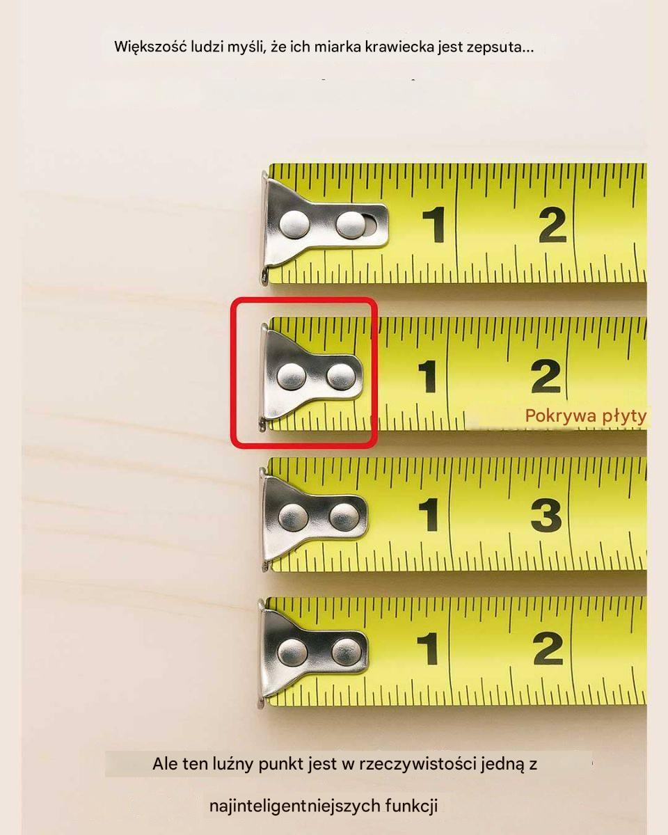 Upewnij się, że taśma leży płasko i nie jest skręcona ani zwisa, ponieważ może to wpłynąć na dokładność pomiaru. Użyj mechanizmu blokującego (jeśli jest dostępny) lub poproś kogoś o pomoc w utrzymaniu taśmy na miejscu.