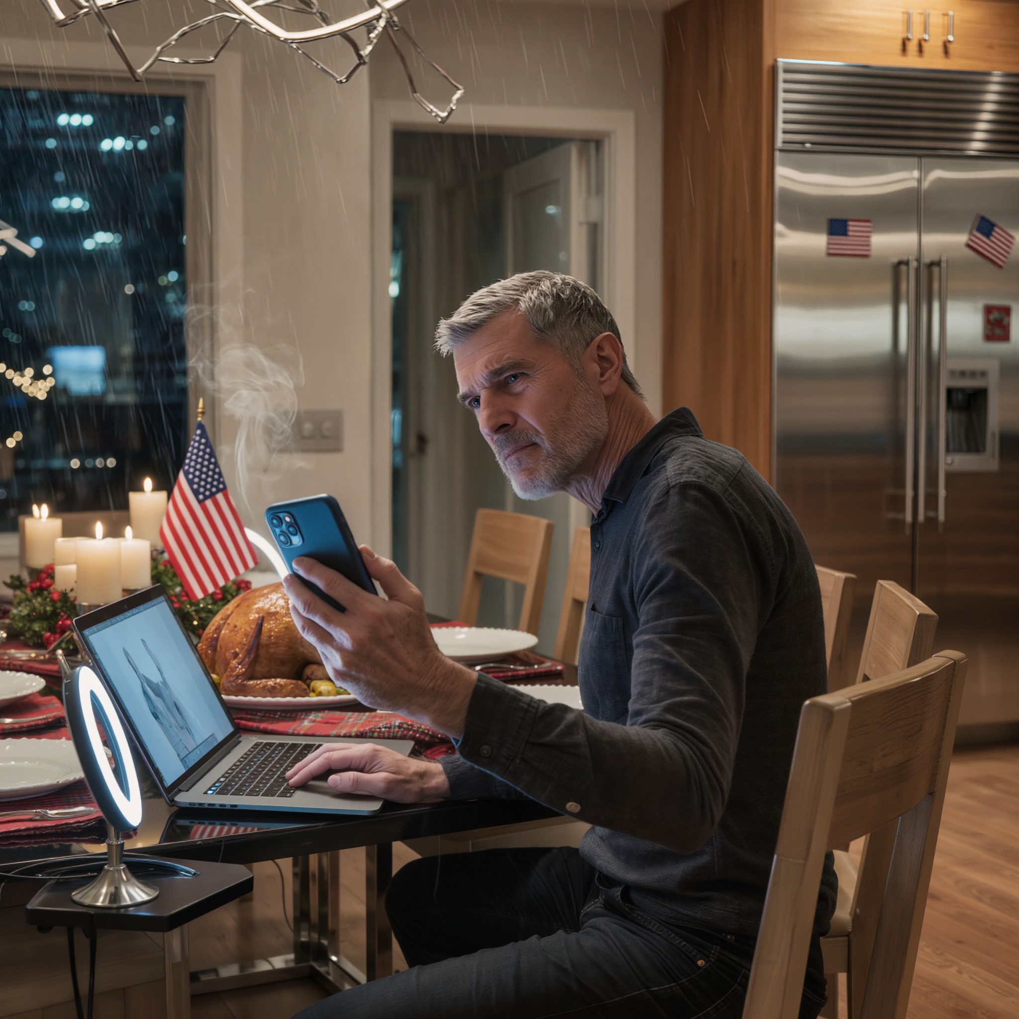 Wyciągnął z torby małą lampę pierścieniową, ustawił telefon na statywie i tak ustawił ujęcie, aby kamera mogła mnie zobaczyć na czele stołu — dziewięć nakryć, osiem pustych krzeseł, dwa małe, które wyglądały jak ciche oskarżenie.